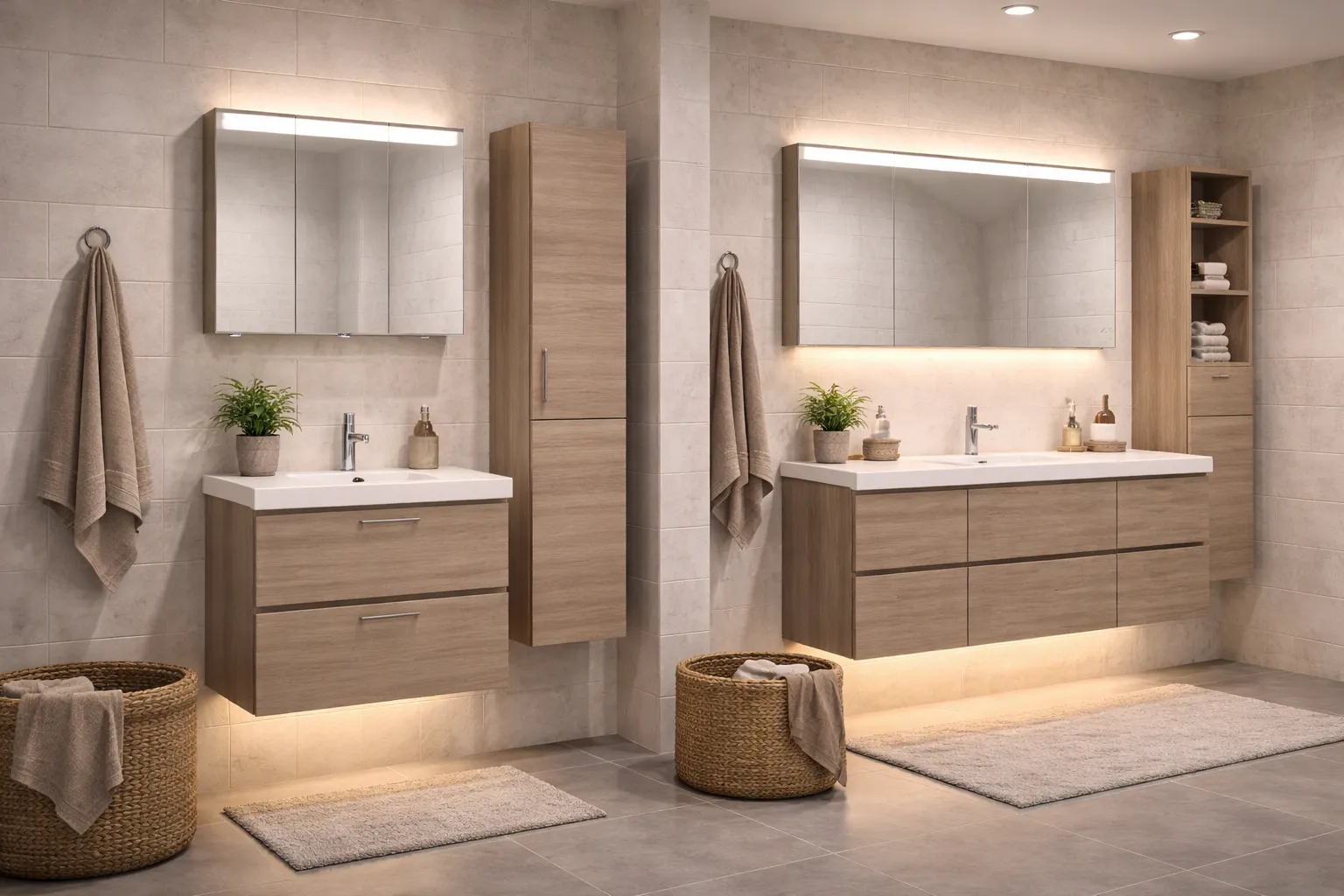 - 120 cm+: comfortabel, vaak met dubbele wastafel of veel lade-opslag