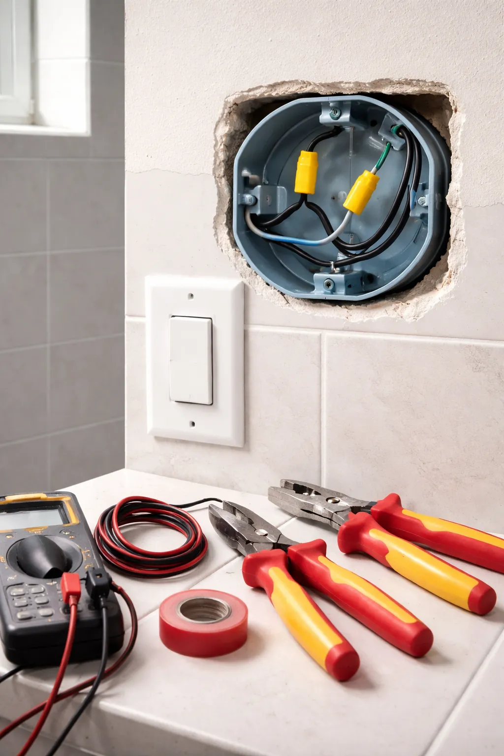 Werk je aan elektra in de badkamer: zet altijd de stroom uit in de meterkast en controleer of de spanning echt weg is (spanningszoeker/multimeter). Twijfel je over de draden, vochtzones of aarding? Laat het doen door een elektricien.