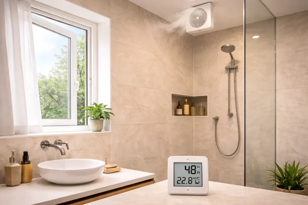 Kleine badkamers hebben sneller condens. Goede afzuiging voorkomt schimmel en muffe geuren. Lees meer in schimmel in de badkamer voorkomen en bekijk ook ventilatie in de badkamer zonder afvoer.