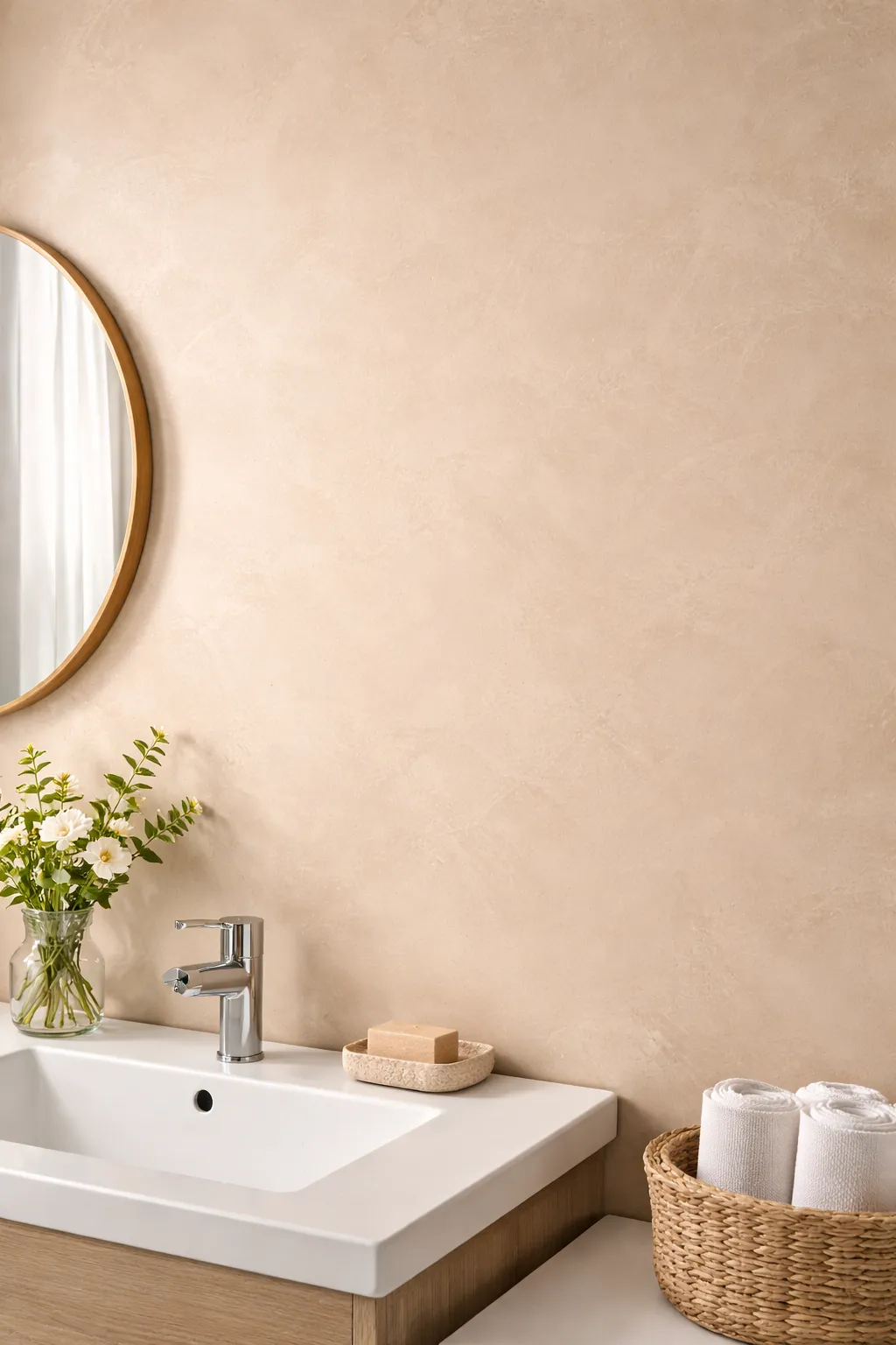 Tadelakt combineert mooi met hout, natuursteen, messing en zachte verlichting. Een goed lichtplan versterkt het effect. Lees daarvoor lichtplan badkamer: zo maak je het functioneel sfeervol.
